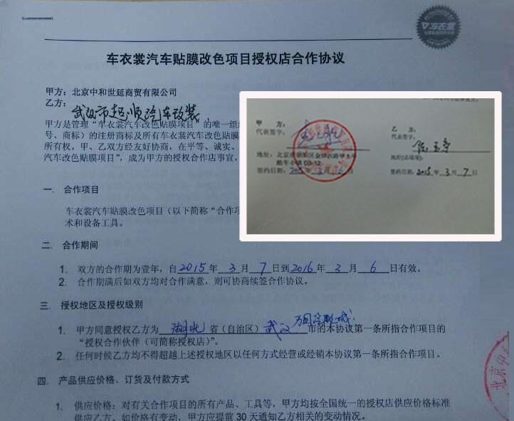 2015开年后,车衣裳总部迎来了批发批发加盟热潮,来自上海、浙江、江西、福建、安徽、江苏、贵州、湖北等多地的创业投资伙伴纷纷加入车衣裳阵营,全国批发批发加盟合作商直逼800家。后又被授予“315消费者最信赖品牌”和“中国汽车美容养护业领袖联盟成员单位”。可谓是荣誉、财富双丰收,彰显中国车身贴膜改色行业领袖风采。